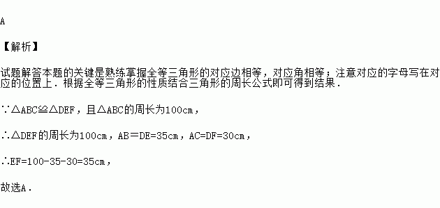 △ABC≌△DEF,且△ABC的周长为100cm,A、B分别与D、E对应,且AB=35cm,DF=30cm,则EF的长为( )