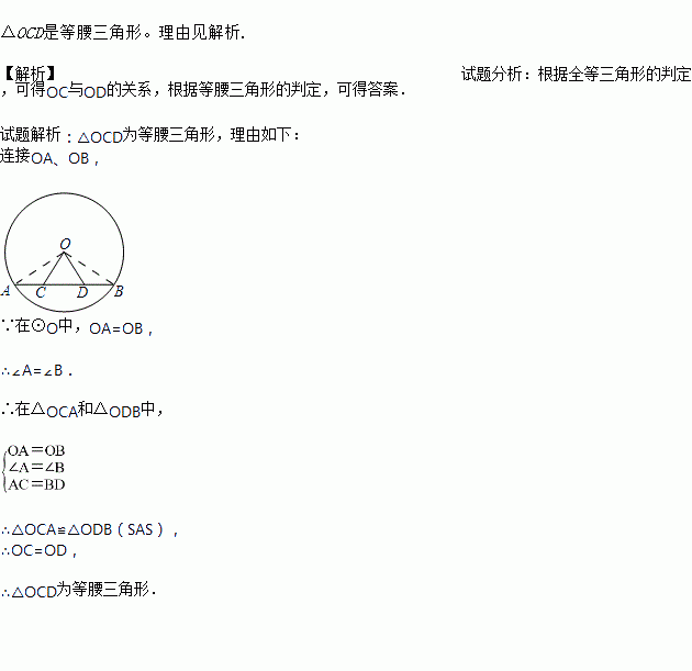 如图,AB是⊙O的弦,点C、D在AB上,且AC?BD.判断△OCD的形状,并说明理由.