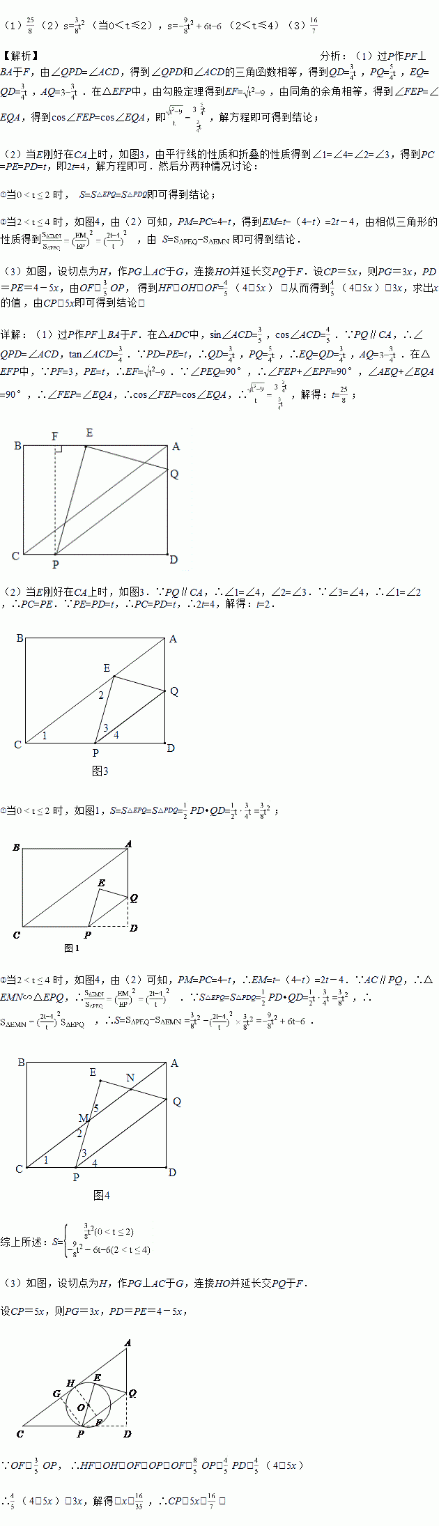 如图1,在矩形ABCD中,AD=3,DC=4,动点P在线段DC上以每秒1个单位的速度从点D向点C运动,过点P作PQ∥AC交AD于Q,将△PDQ沿PQ翻折得到△PQE. 设点P的运动时间为t(s).