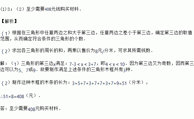“佳园工艺店”打算制作一批有两边长分别是7分米,3分米,第三边长为奇数(单位:分米)的不同规格的三角形木框.