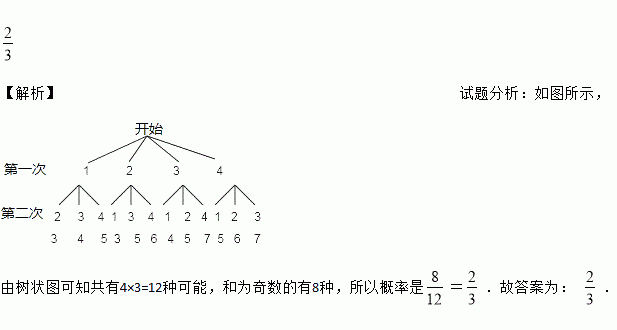 从分别标有1、2、3、4的四张卡片中,一次同时抽2张,其中和为奇数的概率是 .