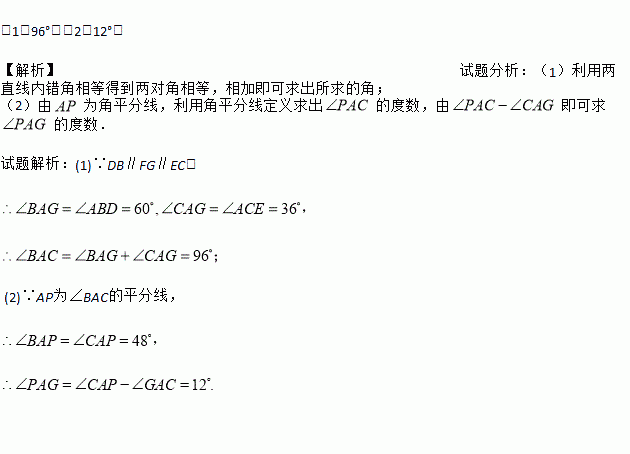 已知DB∥FG∥EC,A是FG上一点,∠ABD=60°,∠ACE=36°,AP平分∠BAC,求:⑴∠BAC的大小;⑵∠PAG的大小.