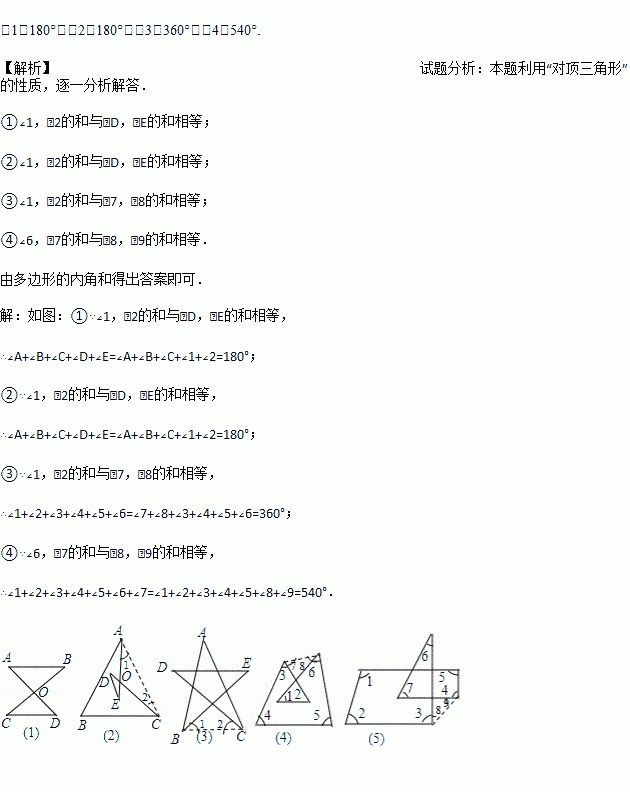 (5)如图(5),∠1+∠2+∠3+∠4+∠5+∠6+∠7= .