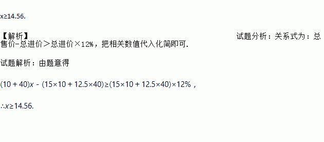 某商店先在广州以每件15元的价格购进某种商品10件,后来又到深圳以每件12.5元的价格购进同种商品40件,如果商店销售这些商品时,每件定价为x元,则会获得不少于12%的利润,用不等式表示以上问题中的不等关系,并把这个不等式变形为“x≥a”或“x≤a”的形式.