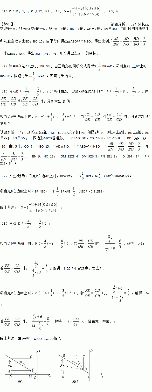 (3)点P在线段AB或线段BC上运动时,作PE⊥x轴,垂足为点E,当△PEO与△BCD相似时,求出相应的t值.