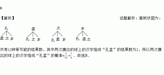 (2017济宁)将分别标有“孔”“孟”“之”“乡”汉字的四个小球装在一个不透明的口袋中,这些球除汉字外无其他差别,每次摸球前先搅拌均匀,随机摸出一球,不放回;再随机摸出一球,两次摸出的球上的汉字组成“孔孟”的概率是( )
