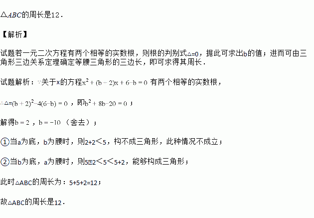 在等腰△ABC中,三边分别为a、b、c,其中a=5,若关于x的方程x2+(b+2)x+6﹣b=0有两个相等的实数根,求△ABC的周长.