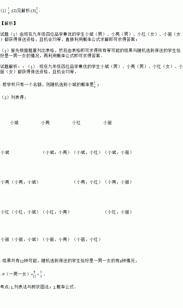 近年深圳进行高中招生制度改革,某初中学校获得保送(指标生)名额若干,现在九年级四位品学兼优的学生小斌(男)、小亮(男)、小红(女)、小丽(女)都获得保送资格,且机会均等.
