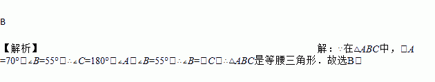 B 【解析】【解析】 ∵在△ABC中,∠A=70°,∠B=55°,∴∠C=180°﹣∠A﹣∠B=55°,∴∠B=∠C,∴△ABC是等腰三角形.故选B.