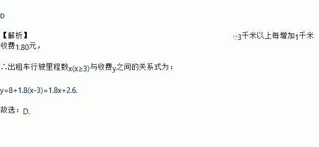 则收费y(元)与出租车行驶里程数x(km)(x≥3)之间的关系式为( )