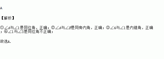 如图,下列判断:①∠A与∠1是同位角;②∠A与∠B是同旁内角;③∠4与∠1是内错角;④∠1与∠3是同位角.其中正确的是( )