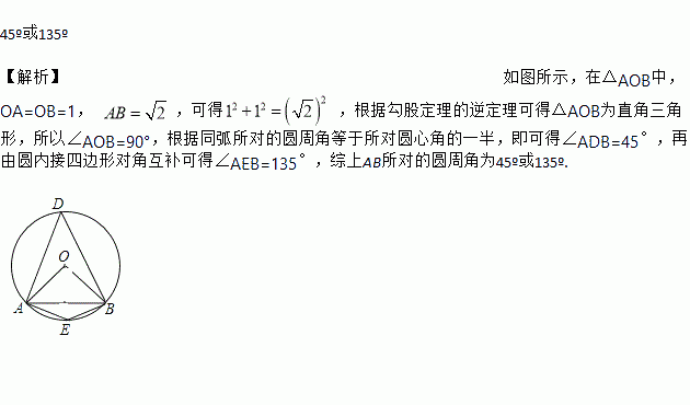 已知⊙O半径为1,A、B在⊙O上,且,则AB所对的圆周角为___________.