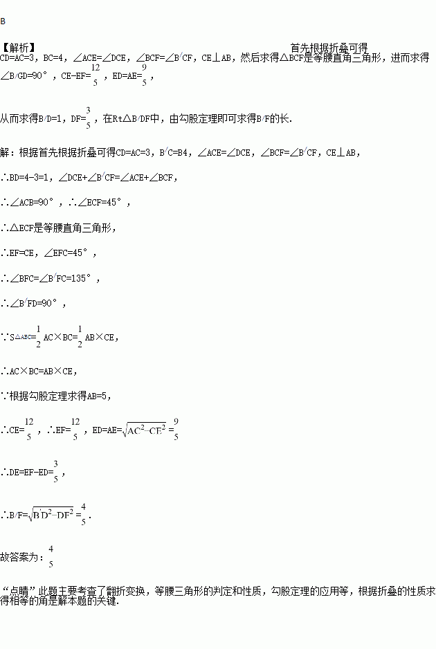 如图,Rt△ABC中,∠ACB=90°,AC=3,BC=4,将边AC沿CD翻折,使点A落在AB上的点E处;再将边BC沿CF翻折,使点B落在CE的延长线上的点B′处,两条折痕与斜边AB分别交于点D、F,则线段B′F的长为( )