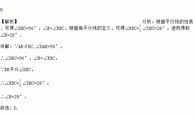 如图,BE平分∠DBC,点A是BD上一点,过点A作AE∥BC交BE于点E,∠DAE=56°,则∠E的度数为( )
