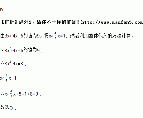 若代数式3x2-4x+6的值为9,则x2-x+8的值为( )