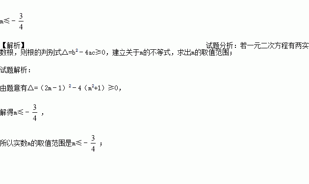 关于x的一元二次方程x2﹣(2m﹣1)x+m2+1=0。若方程有实数根,求实数m的取值范围。