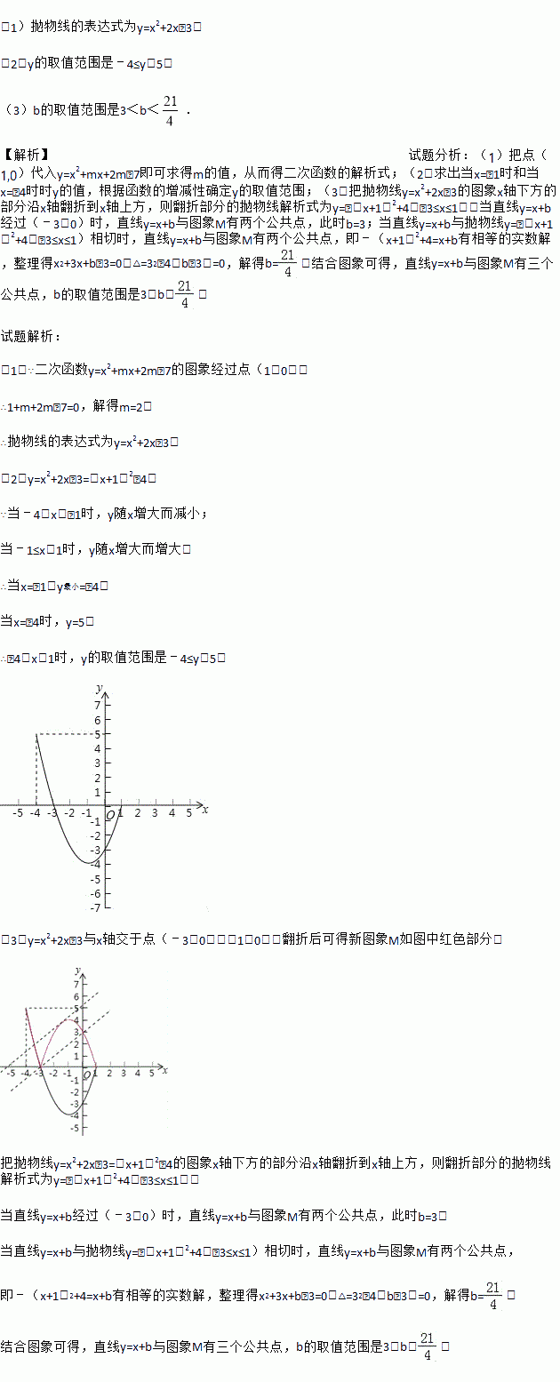 (3)在(2)的条件下,将图象H在x轴下方的部分沿x轴翻折,图象H的其余部分保持不变,得到一个新图象M.若直线y=x+b与图象M有三个公共点,求b的取值范围.