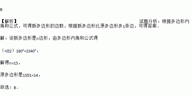 如图,一个多边形纸片按图示的剪法剪去一个内角后,得到一个内角和为2340°的新多边形,则原多边形的边数为( )