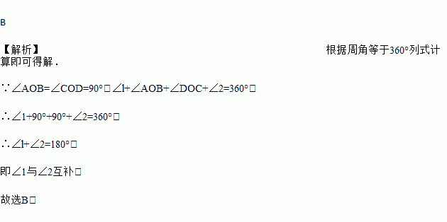 已知:如图,∠AOB=∠COD=90°,则∠1与∠2的关系是( )