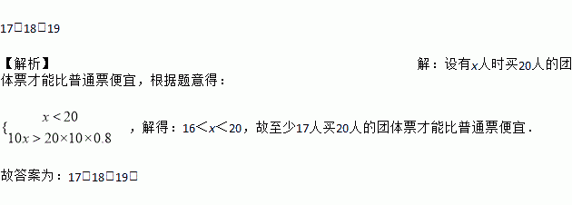 17,18,19 【解析】【解析】 设有x人时买20人的团体票才能比普通票便宜,根据题意得: ,解得:16<x<20,故至少17人买20人的团体票才能比普通票便宜. 故答案为:17,18,19.