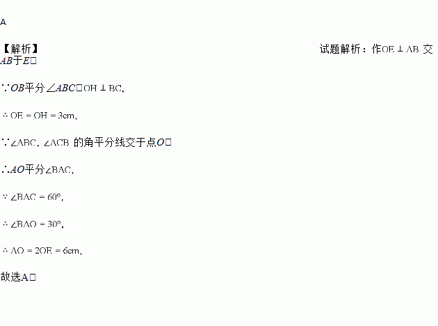 如图,已知△ABC,∠ABC,∠ACB的角平分线交于点O,连接AO并延长交BC于D,OH⊥BC于H,若∠BAC=60°,OH=3cm,OA长为( )cm.