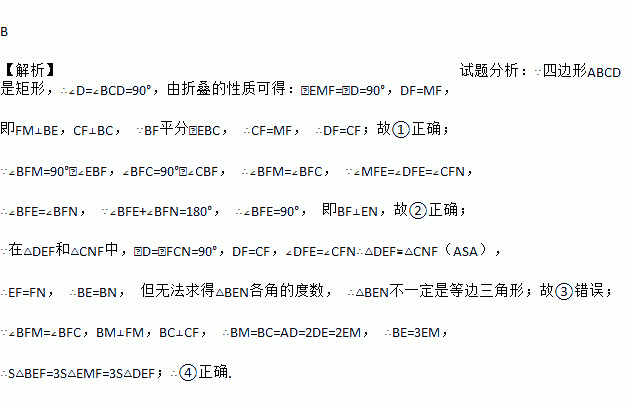 如图,在矩形ABCD中,点E是AD的中点,∠EBC的平分线交CD于点F,将△DEF沿EF折叠,点D恰好落在BE上的点M处,延长BC,EF交于点N,有下列四个结论:①DF=CF;②BF⊥EN;③△BEN是等边三角形;④S△BEF=3S△DEF.其中正确的结论是(B)