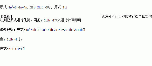先化简再求值:(2a-b)2-2(a+1)(a-2b),其a=2,b=-1.