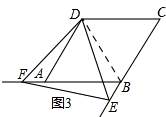 (2)再次旋转三角形纸片,当点E、F分别在CB、BA的延长线上时,如图3请直接写出DE与DF的数量关系;
