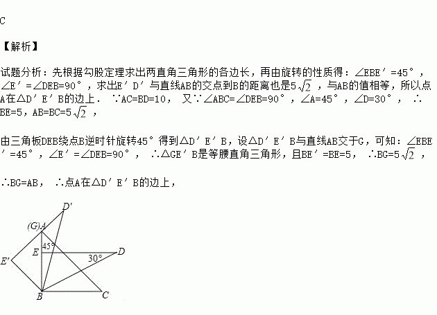 C 【解析】 试题分析:先根据勾股定理求出两直角三角形的各边长,再由旋转的性质得:∠EBE′=45°,∠E′=∠DEB=90°,求出E′D′与直线AB的交点到B的距离也是5,与AB的值相等,所以点A在△D′E′B的边上. ∵AC=BD=10, 又∵∠ABC=∠DEB=90°,∠A=45°,∠D=30°, ∴BE=5,AB=BC=5, 由三角板DEB绕点B逆时针旋转45°得到△D′...