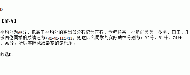 在一次数学测试中,七(2)班的平均分为85分,把高于平均分的高出部分数记为正数,老师将某一小组的美美、多多、田田、乐乐四位同学的成绩记为+7,-4,-11,+13,则这四位同学实际成绩最高的是( )