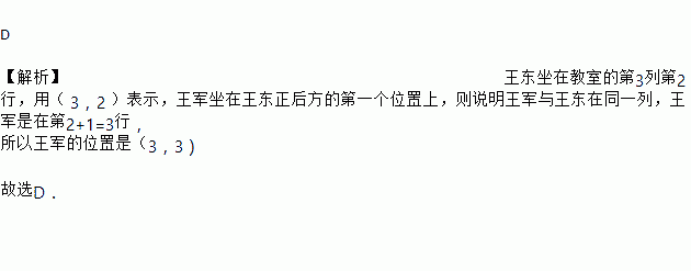 王东坐在教室的第3列第2行,用(3,2)表示,李军坐在王东正后方的第一个位置上,李军的位置是( )