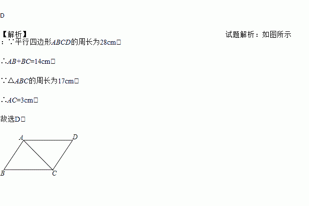 若□ABCD的周长为28,△ABC的周长为17cm,则AC的长为( )