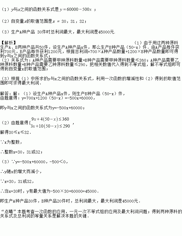 某工厂现有甲种原料360千克,乙种原料290千克,计划利用这两种原料生产A、B两种产品共50件.已知生产一件A种产品需用甲种原料9千克、乙种原料3千克,可获利润700元;生产一件B种产品需用甲种原料4千克、乙种原料10千克,可获利润1200元。设生产A种产品的生产件数为x, A、B两种产品所获总利润为y (元)