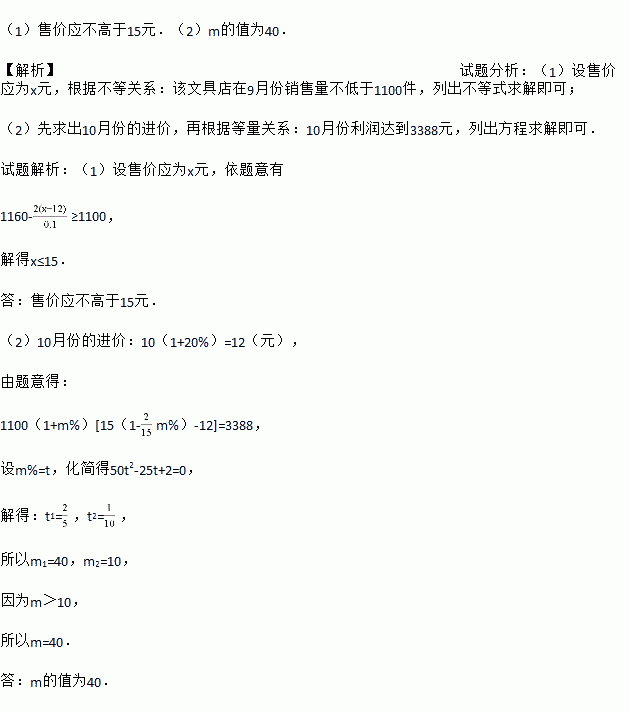 (2)由于销量好,10月份该文具进价比8月底的进价每件增加20%,该店主增加了进货量,并加强了宣传力度,结果10月份的销售量比9月份在(1)的条件下的最低销售量增加了m%,但售价比9月份在(1)的条件下的最高售价减少