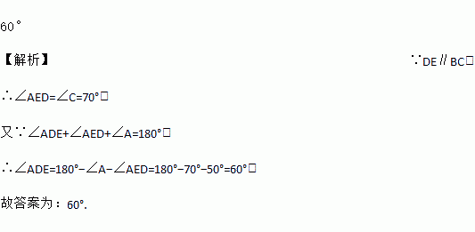 如图,△ABC中,点D、E分别在AB、AC边上,DE∥BC,∠A=50°,∠C=70°,那么∠ADE的度数是______.