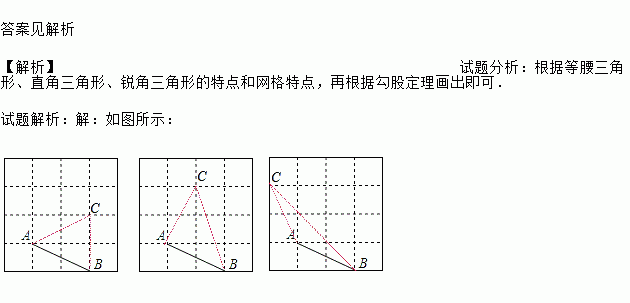 请在下图方格中画出三个以AB为腰的等腰三角形ABC.(要求:1、锐角三角形、直角三角形、钝角三角形各画一个;2、点C在格点上;3、只需画出图形即可,不写画法;4、标上字母,每漏标一个扣1分;)
