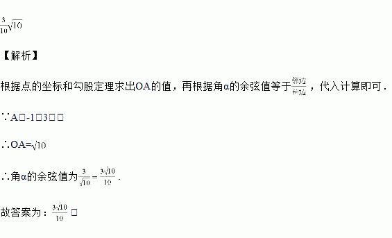 在以O为坐标原点的直角坐标平面内有一点A(﹣1,3),如果AO与y轴正半轴的夹角为α,那么角α的余弦值为________ .