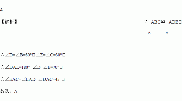 如图△ABC≌△ADE,若∠B=80°,∠C=30°,∠DAC=25°,则∠EAC的度数为( )