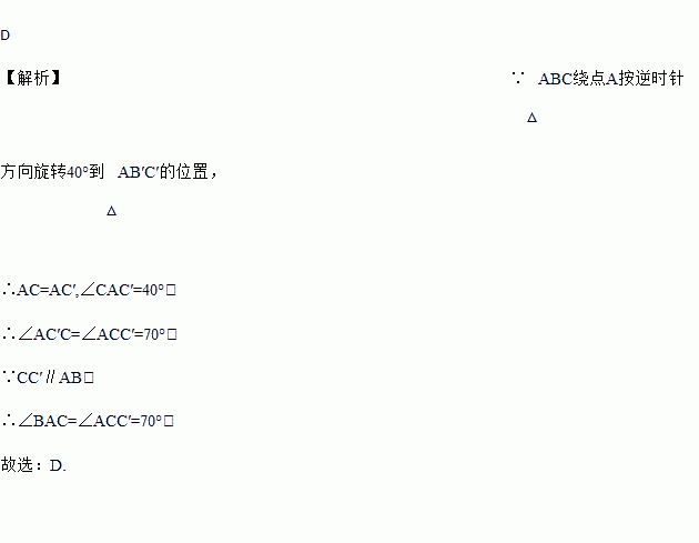 如图,将△ABC绕点A按逆时针方向旋转40°到△AB′C′的位置,连接CC′,若CC′∥AB,则∠BAC的大小是( )