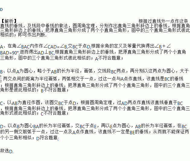 已知△ABC中,∠BAC=90°,用尺规过点A作一条直线,使其将△ABC分成两个相似的三角形,其作法不正确的是( )