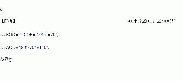 如图,点O在直线AB上,射线OC平分∠DOB.若∠COB=35°,则∠AOD等于( ).