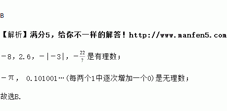 下列一组数:-8,2.6,-|-3|,-π,-,0.101001…(每两个1中逐次增加一个0) 中,无理数有( )