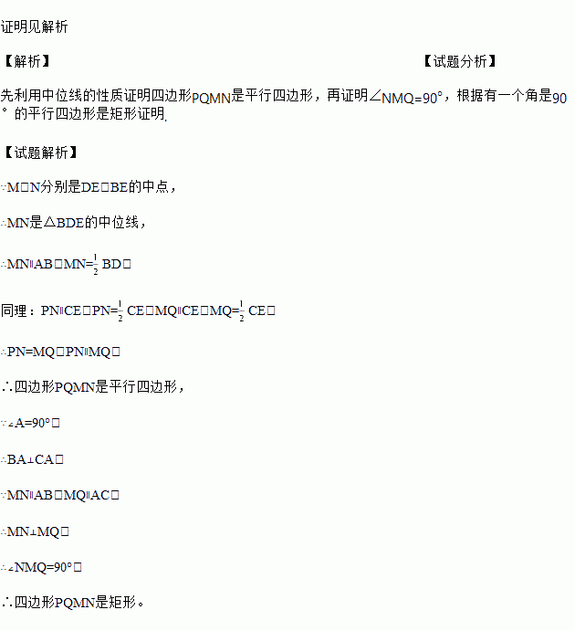 已知:在△ABC中,∠A=90°,D,E分别是AB,AC上任意一点,M,N,P,Q分别是DE,BE,BC,CD的中点,求证:四边形PQMN是矩形。