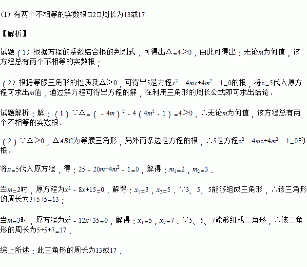 (2)若△ABC为等腰三角形,BC=5,另外两条边是方程的根,求此三角形的周长.2