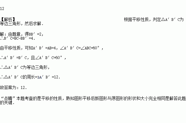 如图,在△ABC中,AB=4,BC=6,∠B=60°,将△ABC沿射线BC的方向平移2个单位后,得到△A′B′C′,连接A′C,则△A′B′C的周长为____;