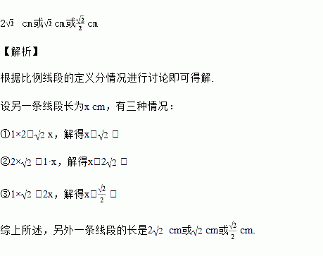 已知三条线段的长分别为1 cm,2 cm, cm,如果另外一条线段与它们是成比例线段,试求出另外一条线段的长.