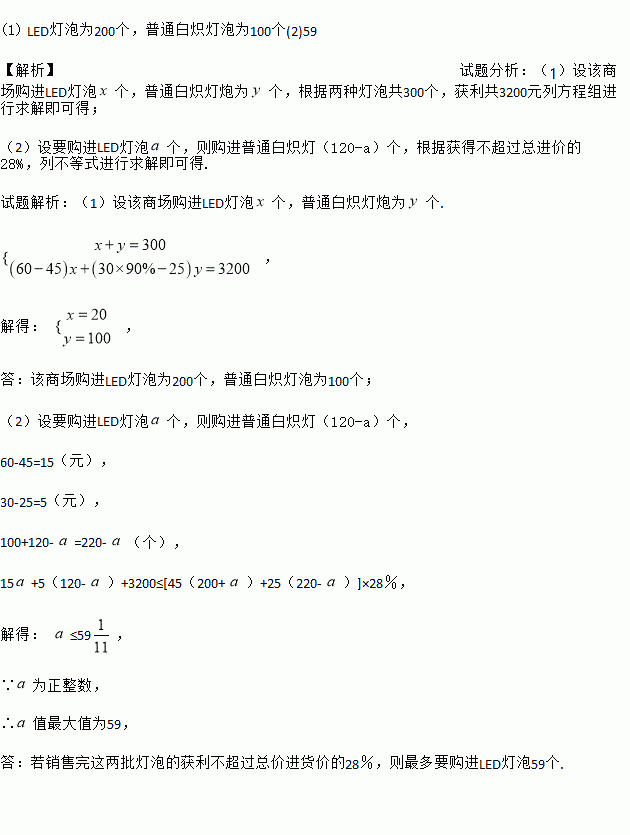 (1)求该商场购进LED灯泡与普通白炽灯泡的数量分别为多少个?