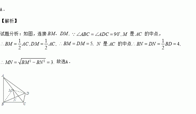 已知:如图,∠ABC=∠ADC=900,M、N分别是AC、BD的中点,AC=10,BD=8,则MN为( )