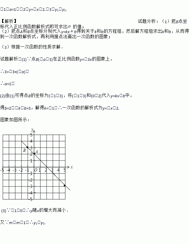 (1)a=1;(2)y=-x+2.(3)y1<y2. 【解析】试题分析:(1)把B点坐标代入正比例函数解析式即可求出的值; (2)把点A和B点坐标分别代入y=kx+b得到关于k和b的方程组,然后解方程组求出k和b,从而得到一次函数解析式,再利用描点法画出一次函数的图象; (3)根据一次函数的性质求解. 试题解析:(1)∵点B(-a,3)在正比例函数y=-3x的图象上, ∴3=...