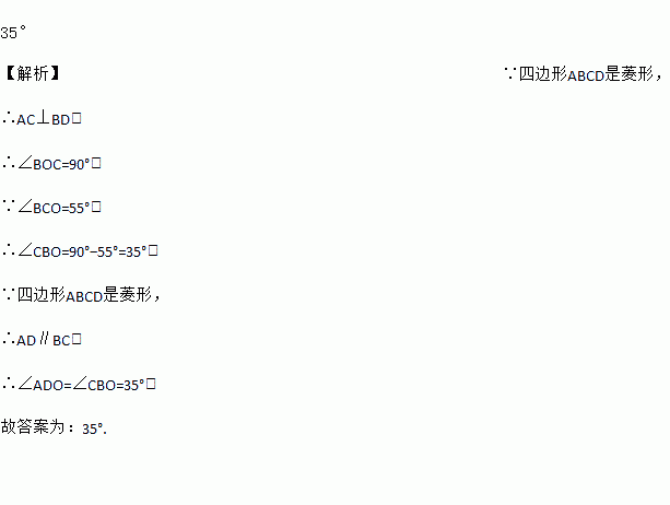 如图,在菱形ABCD中,AC,BD相交于点O,若∠BCO=55°,则∠ADO=____________.